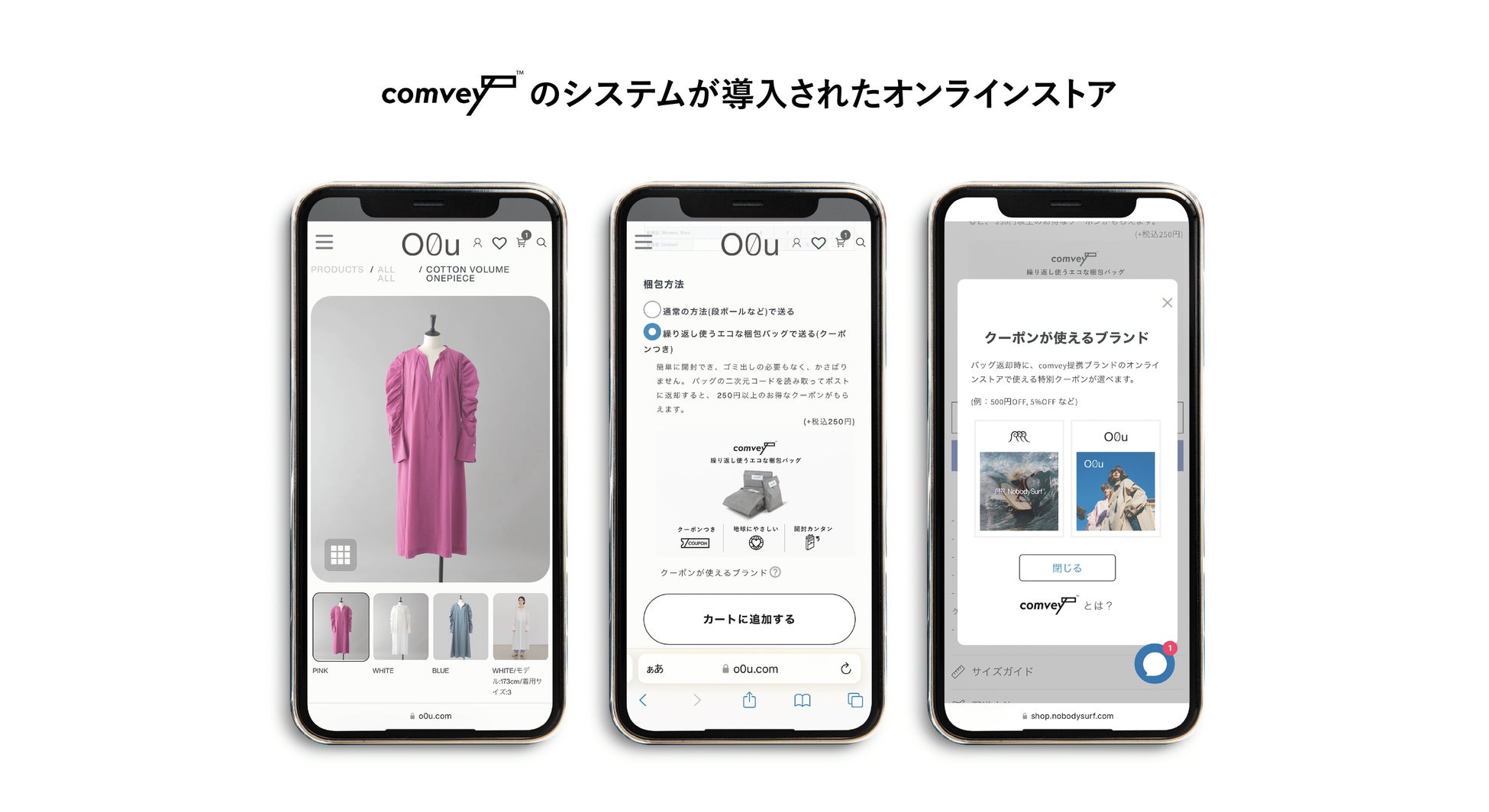 株式会社comveyは、アパレル系EC事業者に対して、繰り返し使うエコな梱包材「シェアバッグ®︎」と、それを運用するオペレーションシステムの提供を開始しました。EC事業者は、本サービスを導入することで配送で発生する梱包ゴミを最小限に抑え、ダンボール回収やゴミ焼却時に発生するCO2を削減し、脱炭素化を推進することが可能となります。comveyのビジョンに共感頂いたパートナーブランドとして、「O0u(オー・ゼロ・ユー)」・「NobodySurf」の2ブランドに導入されています。